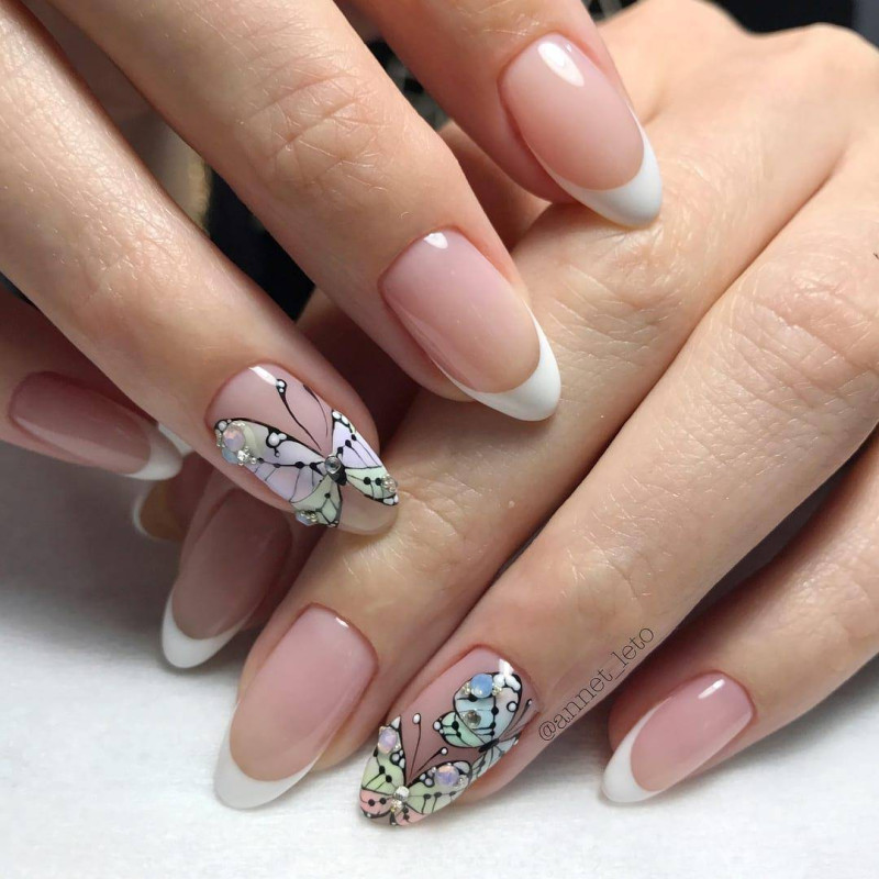 В качестве акцента часто используются тематические рисунки. К примеру, крылья бабочек придают маникюру особой легкости и нежности. К тому же, он может быть выполнен не только в ярких, но и в пастельных тонах. Стразы и блестки в данном случае применяют практически всегда. Ведь именно такой декор способен подчеркнуть всю красоту рисунка.