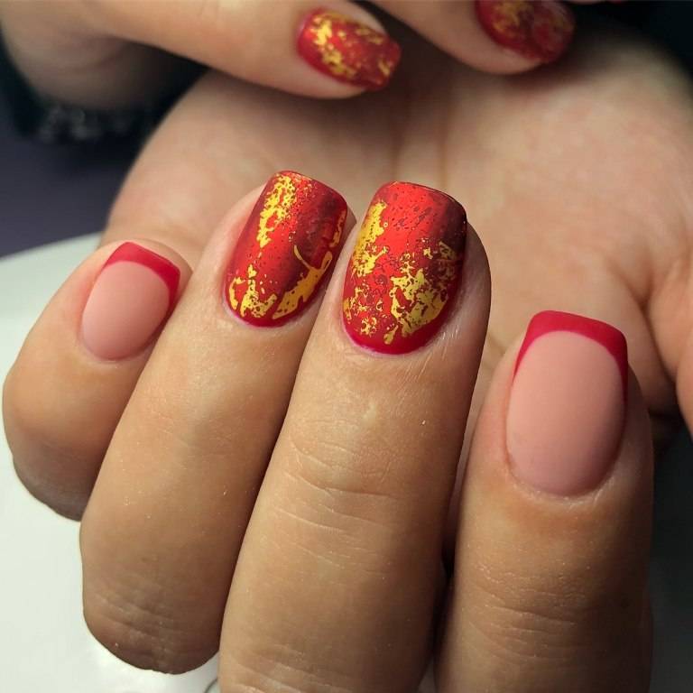 При выборе рисунков важную роль играет короткая форма пластины, круглая или квадратная, она должна визуально удлинять. Красив лунный, угловой, двойной, американский вариант. Рисунки располагаются в середине или сбоку. Актуально сочетание нескольких оттенков.