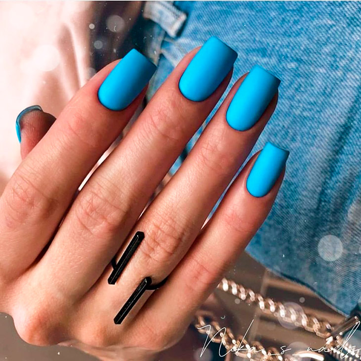 Волшебные свойства матового покрытия заключаются в его уникальной способности чудесно смотреться в любом цвете, и синий бархатный маникюр в 2022 году просто поражает своим изяществом. Вы можете отдать предпочтение одному из глубоких или ярких оттенков, что позволит дополнить маникюр нотками благородства и шика. Светлые и пастельные тона станут чудесным выбором для оформления повседневного или романтического маникюра.
