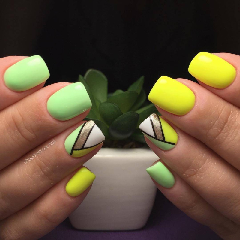 С синей палитрой хорошо сочетаются оттенки желтого. Так, например, на темно-синем фоне, имитирующем ночное небо, можно изобразить ярко-желтые звезды и украсить их золотыми блестками – получится вечерний маникюр. Или на светло-синем фоне нарисовать несколько сочных лимонов с зелеными веточками – идеальный вариант для весны. Синий и желтый лаки можно использовать и для создания оригинальных геометрических узоров. Ромбы, зигзаги, квадраты – благодаря контрасту цветов эти фигуры будут смотреться очень эффектно и ярко.