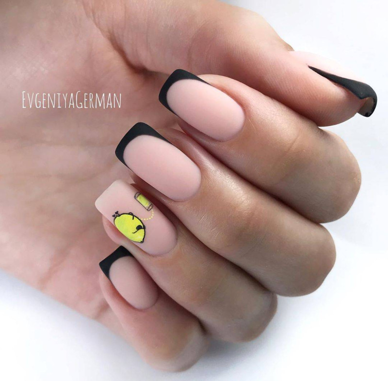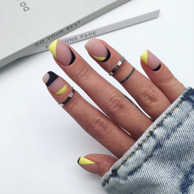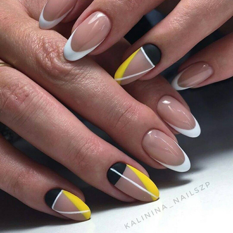 - желтый используется для декора основной части ногтевой пластины, линия «улыбки» рисуется контрастным темным или белым лаком