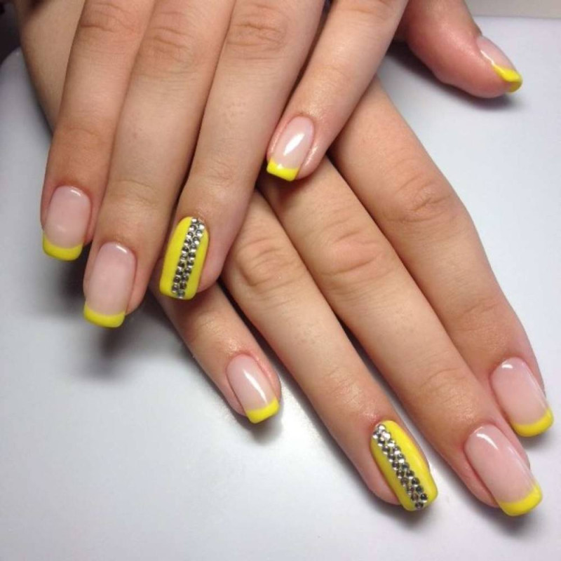 Однотонный желтый френч практически не нуждается в дополнительном декоре. Дизайн выглядит лаконично и привлекательно даже при условии использования всего одного желтого цвета. Если вы хотите разнообразить свой декор и при этом не вносить в него яркие детали, комбинируйте желтый цвет с прозрачным лаком.