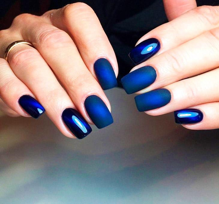 Синий сочетается с огромным количеством цветов и оттенков, но когда вы начнете экспериментировать, помните, что все используемые цвета желательно должны быть теплой или холодной цветовой гаммы. Также не всегда хорошо смотрятся матовые и глянцевые лаки в одном маникюре. Их часто используют совместно, но не часто это выглядит эффектно.
