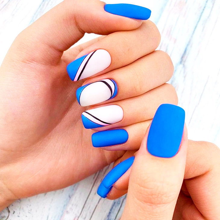 На коротких ногтях синий маникюр, как и любой другой яркий цвет, смотрится всегда интересно. Синий цвет можно сочетать с другими оттенками. Например, с белым. Разбавить однотонный дизайн поможет вертикальный градиент из основных цветов.
