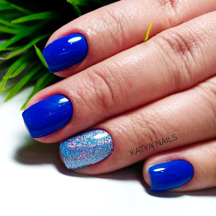 Беспроигрышное сочетание в маникюре, поскольку синий электрик – это вариация классического яркого цвета. Хорошо будет смотреться как однотонным, так и с декором