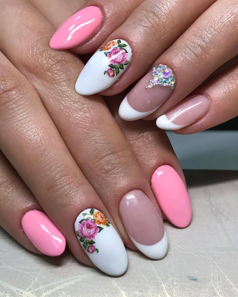 С этими цветами получается невероятно нежный маникюр, который подойдет натурам романтичным. Синий маникюр с цветами пастельных тонов уместно делать в любое время года. Розовый с голубым и фиолетовым больше подойдет для зимы, а если к этим цветам добавить желтый или мятный, то получится весеннее сочетание.