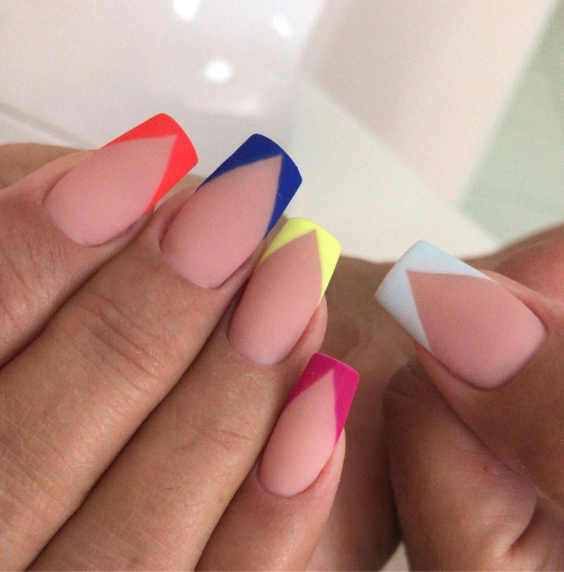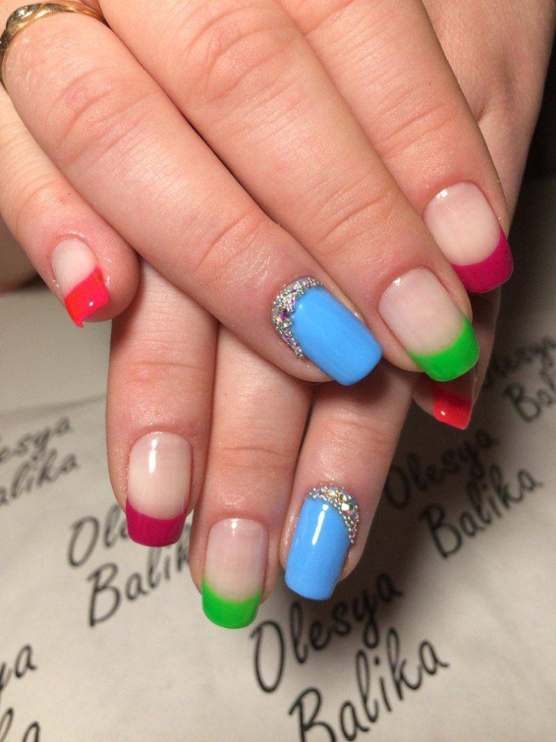 Пёстрые, кислотные и радостные оттенки также имеют популярность среди летнего маникюра, особенно голубой или бирюзовый. Для осеннего либо зимнего периода лучше подбирать более тёмные оттенки.