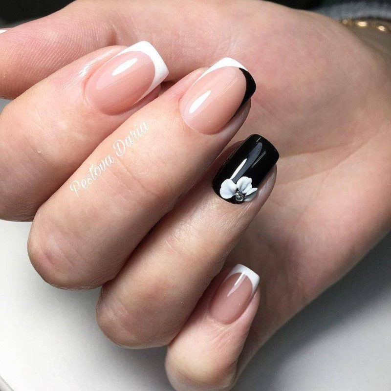 А если на нежно-голубом фоне нарисовать лаконичные черные цветы, получится очень стильный маникюр