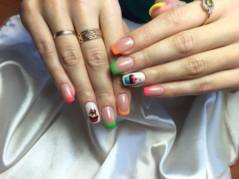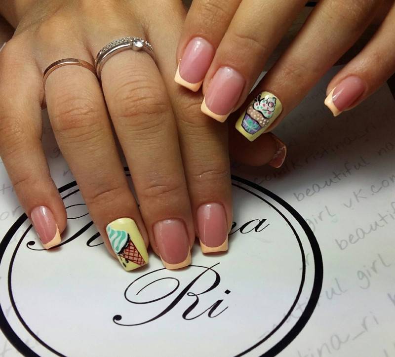 На ноготках отлично смотрится изображение любимых сладостей и коктейлей. Согласитесь, сделать такой дизайн решится не каждая девушка. Но, тем не менее, его по праву можно назвать одним из самых стильных вариантов на лето.