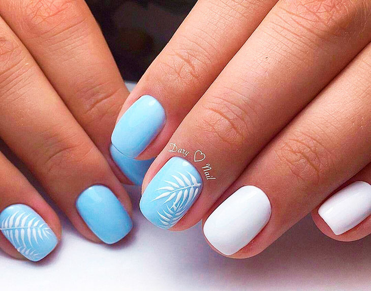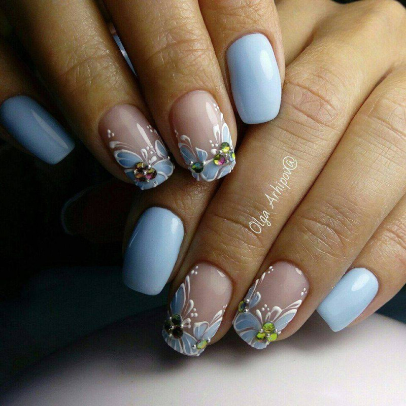 Особенно актуален голубой модный маникюр в весенне-летний период. Одним из самых популярных по-прежнему остается цветочный рисунок. Очень нежно смотрится этот узор в сочетании с белым и розовым. Небесный цвет может выступать в качестве базового или им могут быть прорисованы незабудки. И в том, и в другом случае дизайн получится красивым, стильным и выразительным.
