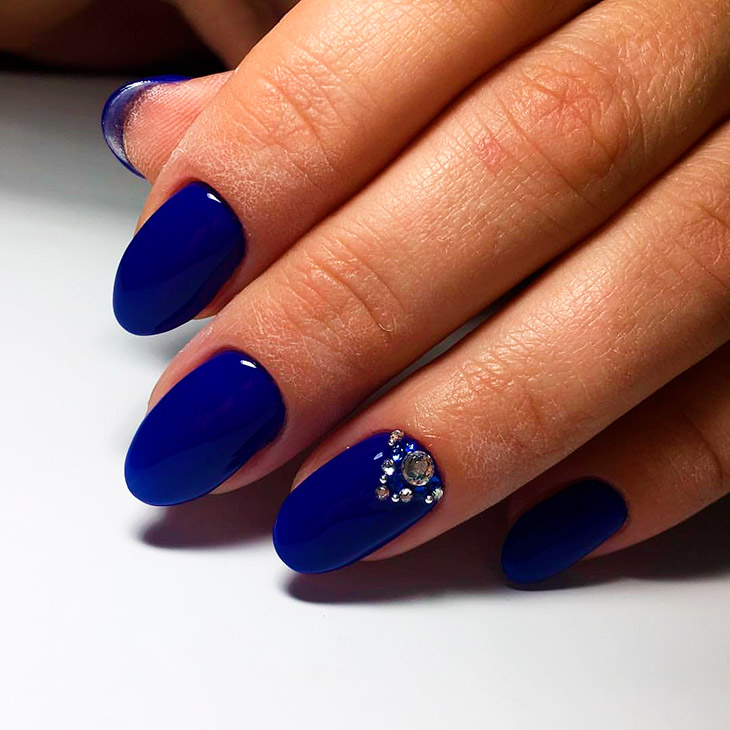 Классическим вариантом оформления ногтей миндальной формы является однотонное покрытие. Миндальные ногти отлично раскрывают весь потенциал синего цвета. На ногтях такой формы он смотрится особенно выразительно. Сразу становится видна вся глубина оттенка. Если хочется разбавить дизайн, сверху можно нанести немного блесток.