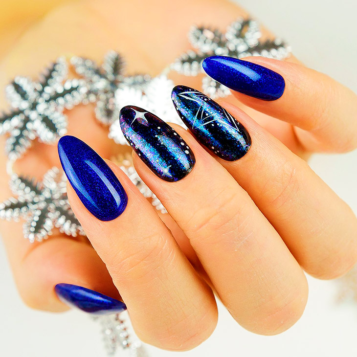 Глубокий синий всегда напоминает о космосе. Для маникюра лучше всего выбрать серебристые тона. Здесь подойдет поталь, которая добавит эффект литья. Хорошо смотрятся однотонные ноготки в глянце.