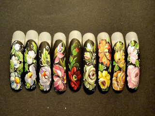 Маникюр, роспись которого выполнена в восточных традициях, характеризуется нанесением двух цветов одним мазком. Чтобы повторить эту уникальную технику у себя на ногтях, необходимо широкой кисточкой набрать на один кончик, первый тон краски, а другой конец кисти второй тон. После чего растушевать цвет на палитре и нанести мазок на поверхность ногтей. Тонкая кисть внесет изящность в дизайн и поможет прорисовать невидимые элементы.