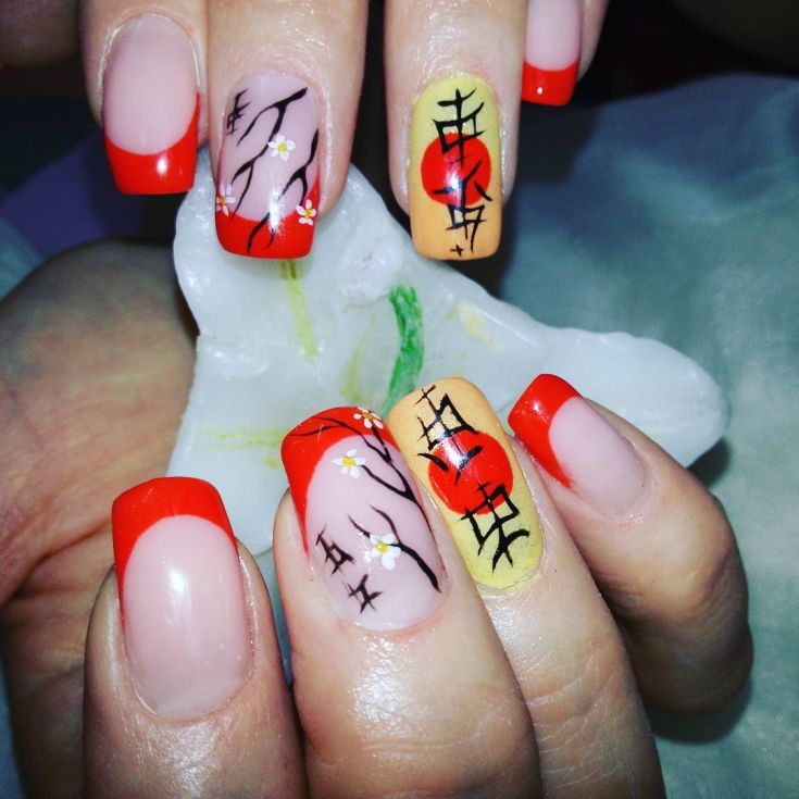 Выбор маникюра с японской тематикой многообразен. Предметами для рисования обычно служат: иероглифы, персонажи аниме, сакура. Если решитесь сделать маникюр с сакурой, то вот вам несколько практических советов: