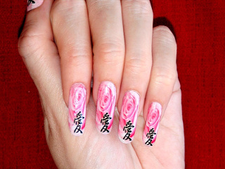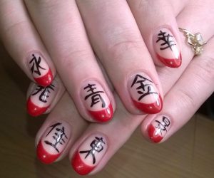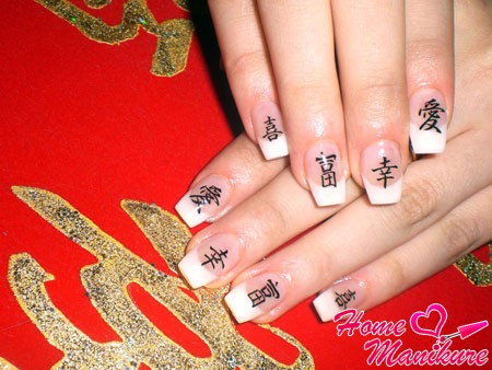 Китайские иероглифы прекрасно смотрятся как на натуральных ногтях, так и на нарощенных. Желательно, чтобы кончики были средними или длинными. На коротких ногтях иероглифы выглядят несколько неопрятно