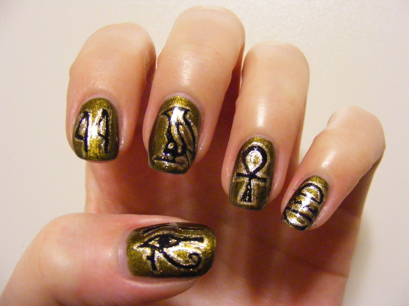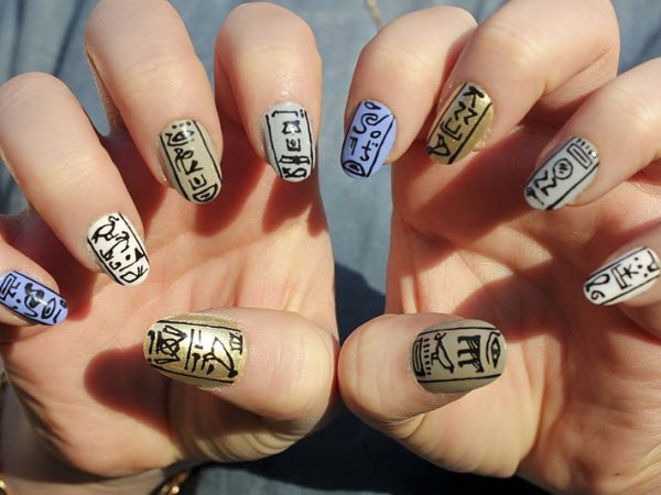 Для эмоциональных и активных женщин отлично подходит маникюр с изображениями египетских иероглифов. Золотистые или серебряные знаки интересно смотрятся на темной основе.