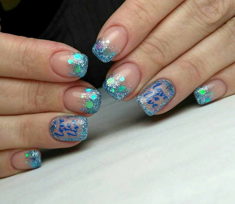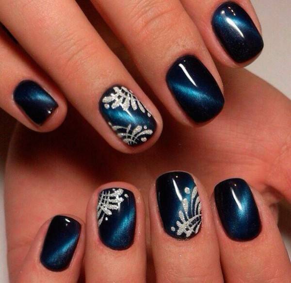 Не менее популярным и прекрасным решение станет покрытие синего цвета. Но такой маникюр для коротких ноготков лучше всего выполнять в холодное время года. Данный дизайн может быть, как праздничным, так и повседневным.