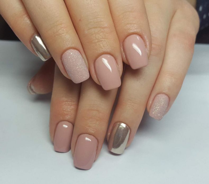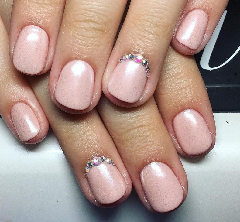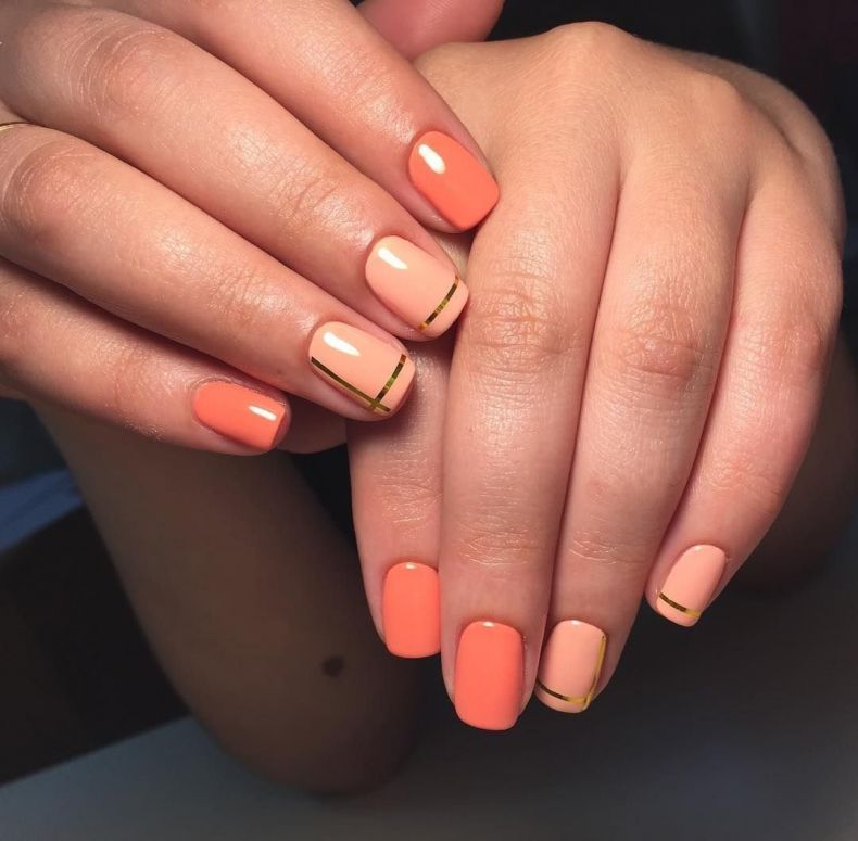 Для аккуратных коротких ноготков модными считаются теплые тона с пастельными оттенками. Это связанно с тем, что все они универсальны и подходят ко всем стилям одежды. Маникюр шеллаком розового или персикового цвета дополнят общий образ женственностью и нежностью.