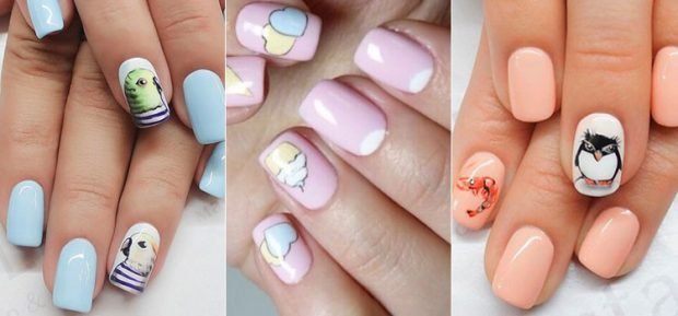 Чтобы короткие пластины выглядели аккуратными и не слишком маленькими, необходимо правильно подобрать рисунок и его размер. Приветствуются модные вертикальные линии или ряд узоров, расположенных от основания к краю ногтя. Размер отдельных изображений должен быть средним, так чтобы умещалось 2–3 элемента на пластине.