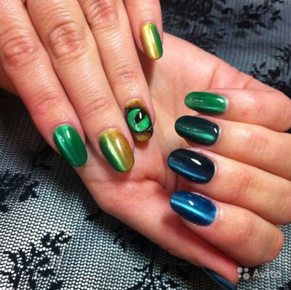 «Кошачий глаз» на ногтях смотрится просто бесподобно. Даже если не использовать дополнительных украшений, он все равно будет смотреться замечательно. Но при хорошем чувстве вкуса, пару ноготков все же можно покрыть любым понравившимся рисунком. А вот закрывать все ногти не стоит, ведь тогда вся загадочность маникюра просто испарится.