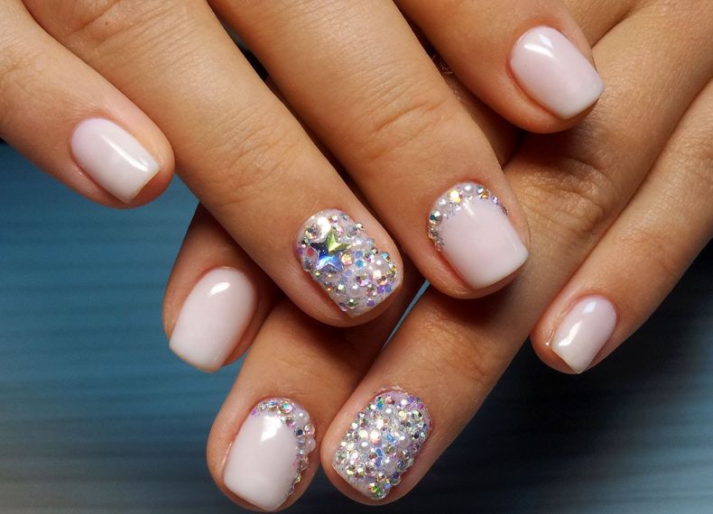 При любом покрытии шеллаком длинные ноготки можно декорировать стразами, камешками, кружевом и с помощью акриловой лепки.