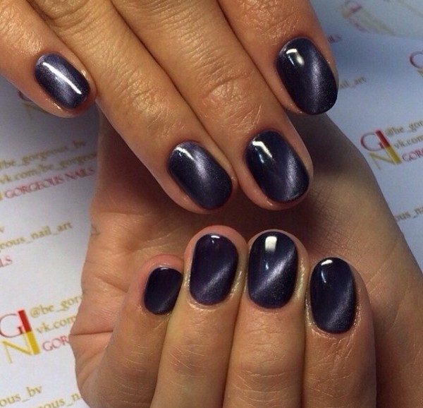 Особенно заманчиво «кошачий глаз» смотрится в темном исполнении. Именно так прослеживается вся глубина игры цвета. На первый взгляд может показаться, что делать его сложно, но это далеко не так. Потребуется специальный лак, содержащий в себе металлические кристалики, и лопатка с магнитом. После того, как лак нанесен на ногти, следует поднести лопатку магнитом вниз, и подождать секунд 10 (смотреть по инструкции). После чего на поверхности ноготка образуется рисунок