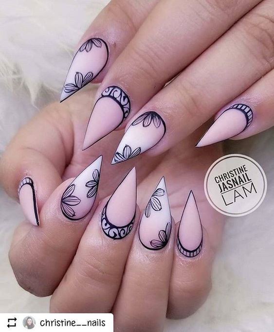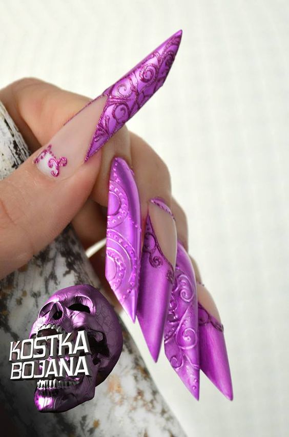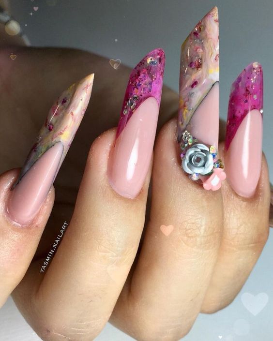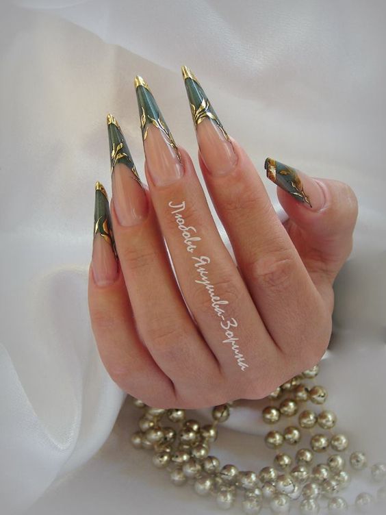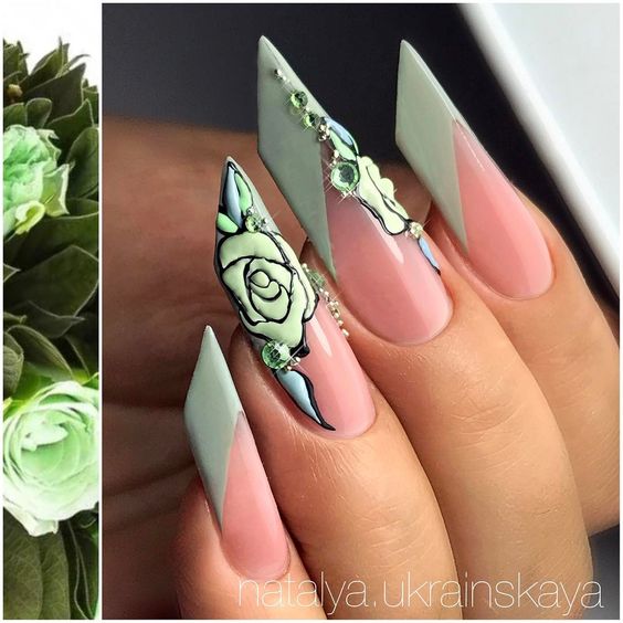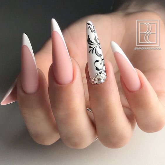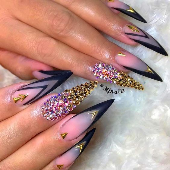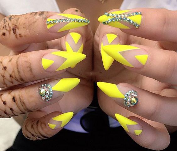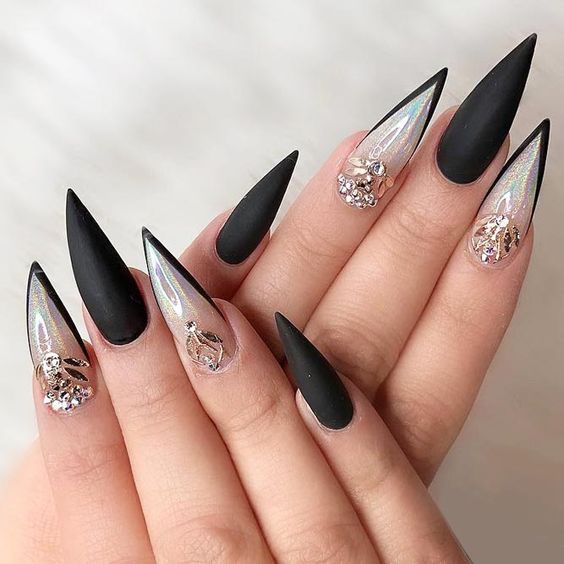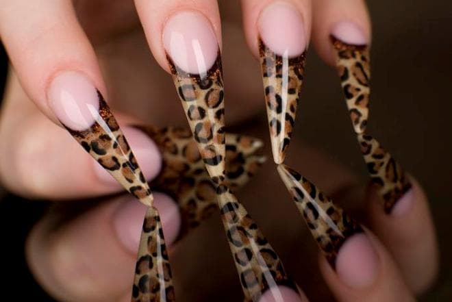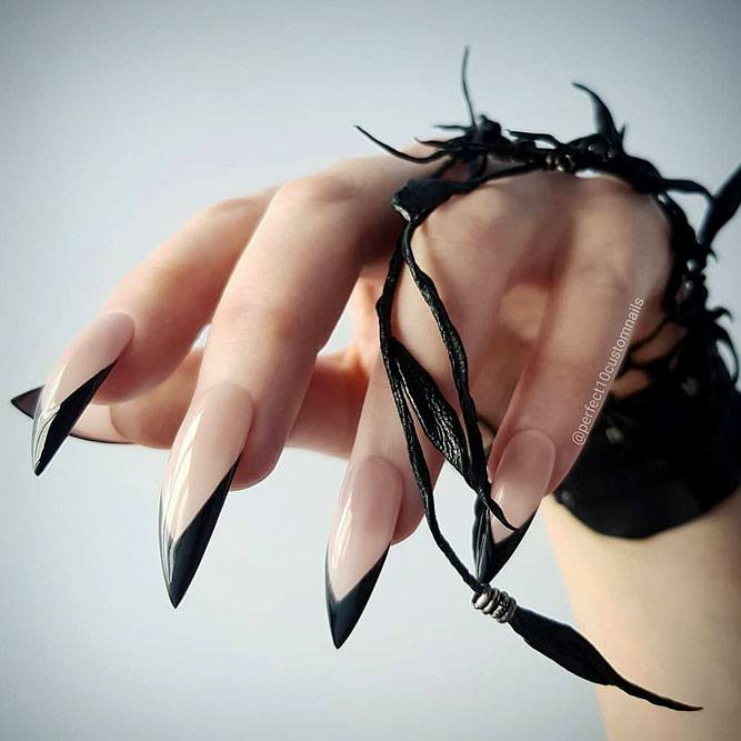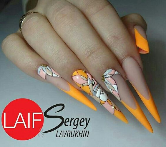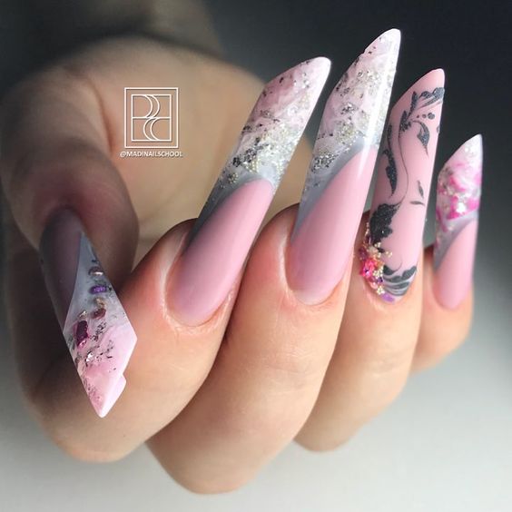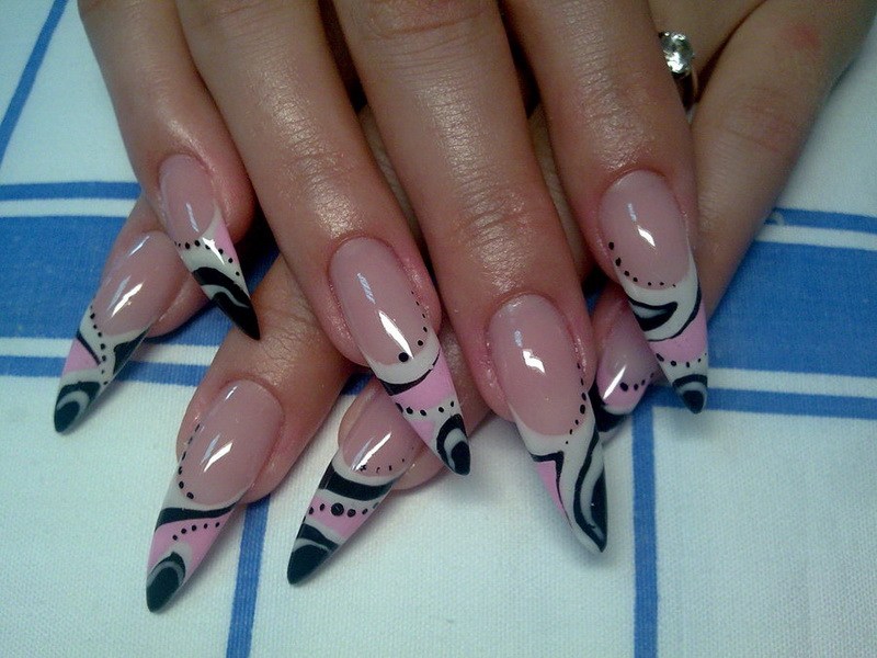 Оставляя в стороне «великую классику», остроконечные гелевые или натуральные ногти очень хорошо поддаются декорированию и украшению особым и эксцентричным нейл-артом, который несколько смягчает конечный эффект, осветляя маникюр.