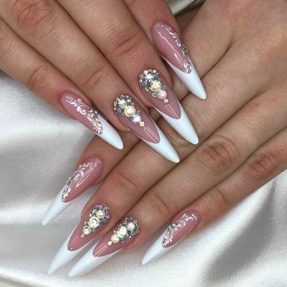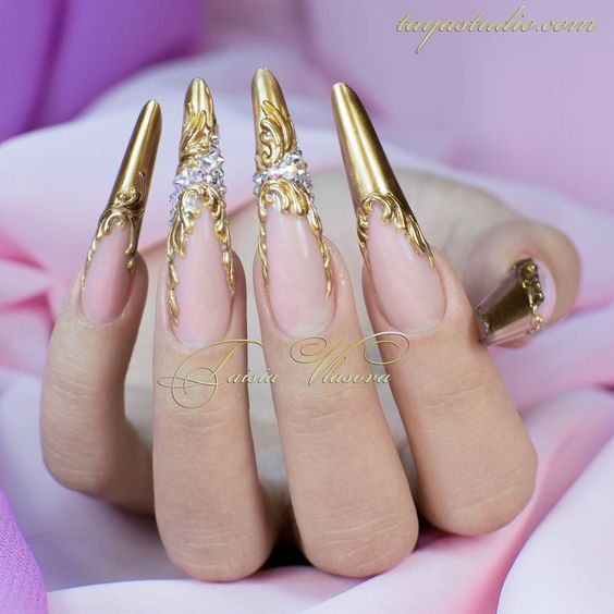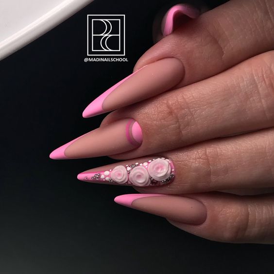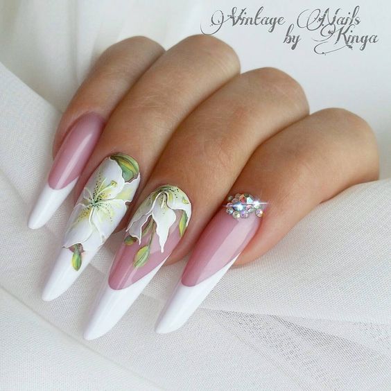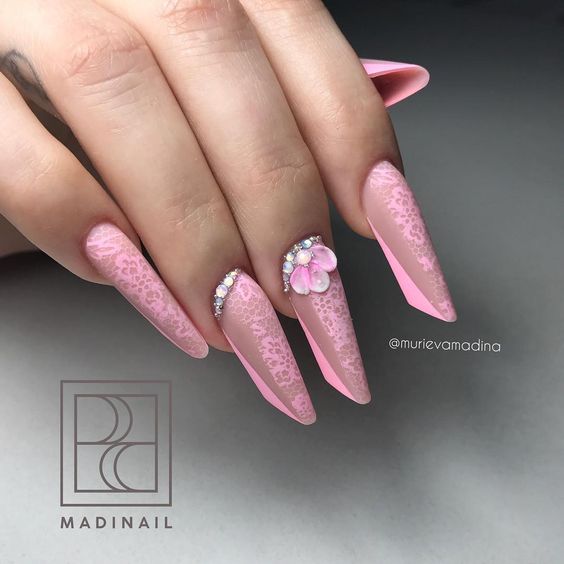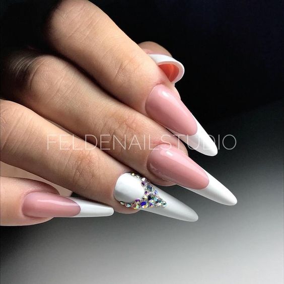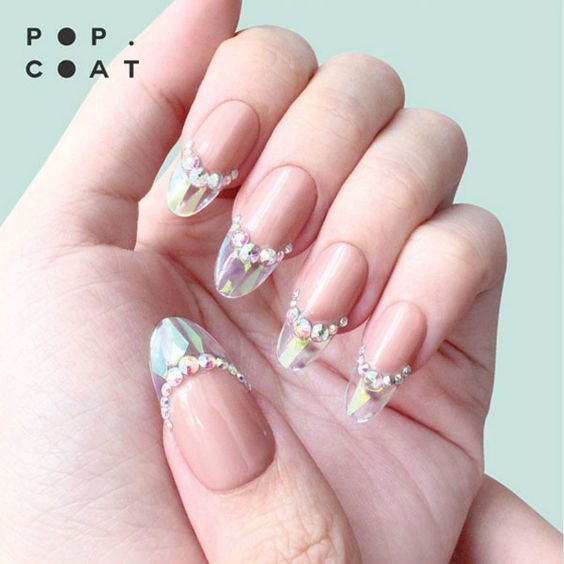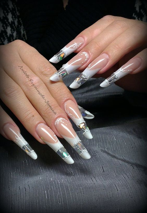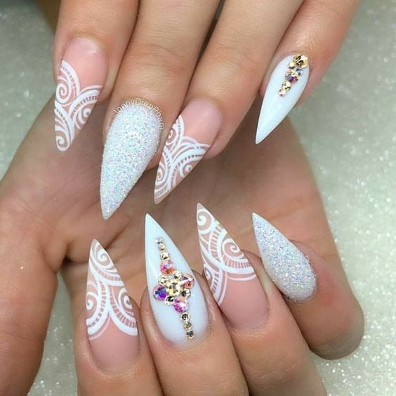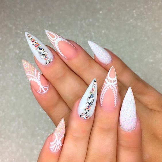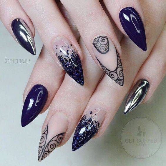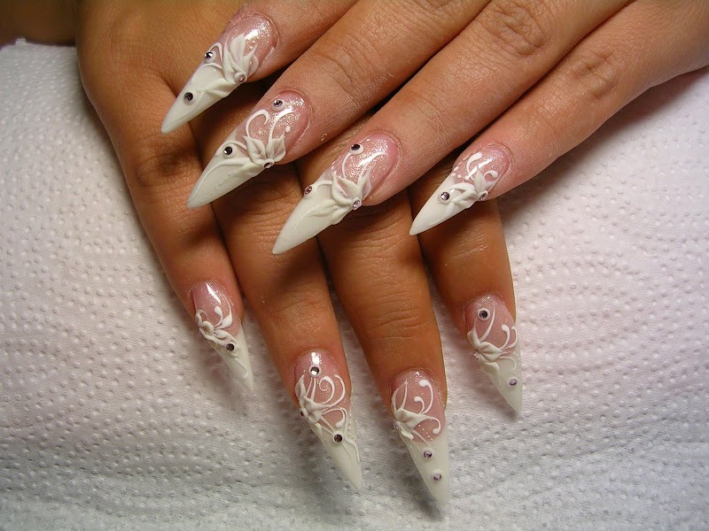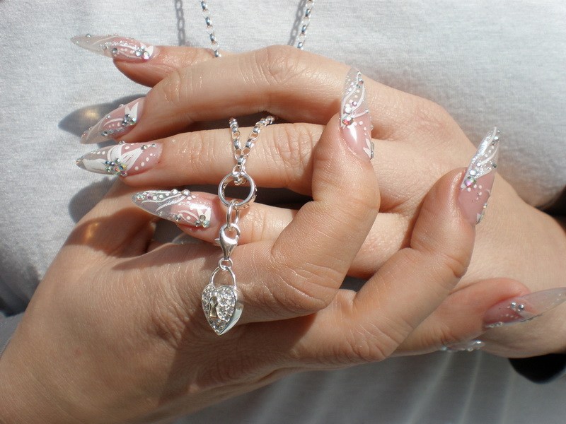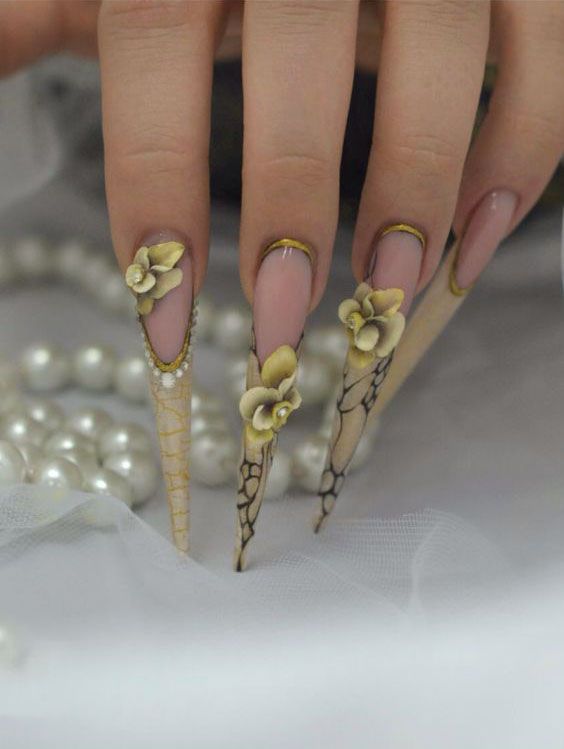 Оставляя в стороне «великую классику», остроконечные гелевые или натуральные ногти очень хорошо поддаются декорированию и украшению особым и эксцентричным нейл-артом, который несколько смягчает конечный эффект, осветляя маникюр.