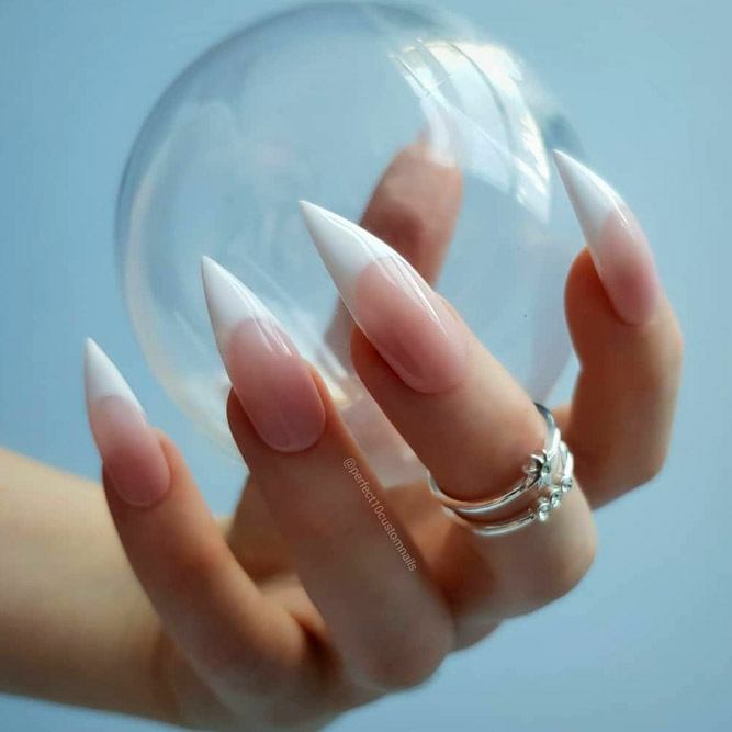 Несмотря на свою популярность, острые ногти не являются столь традиционными, как, например, миндалевидная форма. Но даже на таких ноготках можно сделать интересную и всем полюбившуюся цветовую растяжку. Для этого можно использовать как темные оттенки, так и пастельные тона.