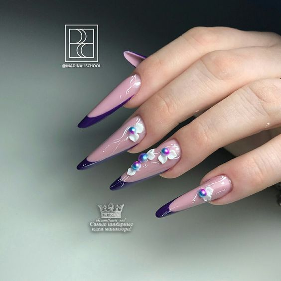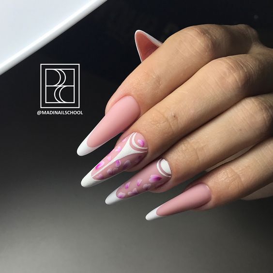 Яркий рисунок в цветочной тематике, расположенный произвольно на ногтях, будет замечательно смотреться на острых длинных ногтях с френчем. При этом цвет френча не обязательно должен быть белым, его можно выполнить в контрастных оттенках с декоративным рисунком. Красиво и нежно на остром френче будет смотреться рисунок в виде точек, полосок или сердечек. Такие рисунки можно выполнить на всех ноготках, на одном или двух пальцах, расположив его по всей пластине либо украсив только улыбку. Красиво и по-летнему будет смотреться острый френч с рисунком морской тематики. Невероятно оригинально выглядит такой маникюр с использованием леопардового принта с аквариумным эффектом.