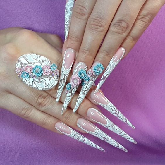 Цветовая гамма на длинных острых ногтях допускается абсолютно любая. Яркие оттенки подчеркнут индивидуальность своей обладательницы, более спокойные подойдут для рабочей и повседневной обстановки. Для вечеринок и других праздничных мероприятий можно воспользоваться различными декоративными элементами, которые смогут дополнить и украсить необычный длинный маникюр.