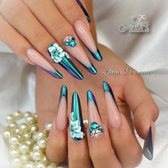 Если вы желаете визуально удлинить свои пальчики, то ногти с острым кончиком – это то, что вам нужно. Они зрительно вытягивают пальцы и делают их чуть тоньше. Руки с маникюром на острые ногти выглядят женственно и грациозно. Чем длиннее ногтевая пластина, тем выигрышнее будет выглядеть общий дизайн. Особенно красиво на такой форме смотрится втирка, которая бывает зеркальной, жемчужной, хамелеон, радужной и т.д.