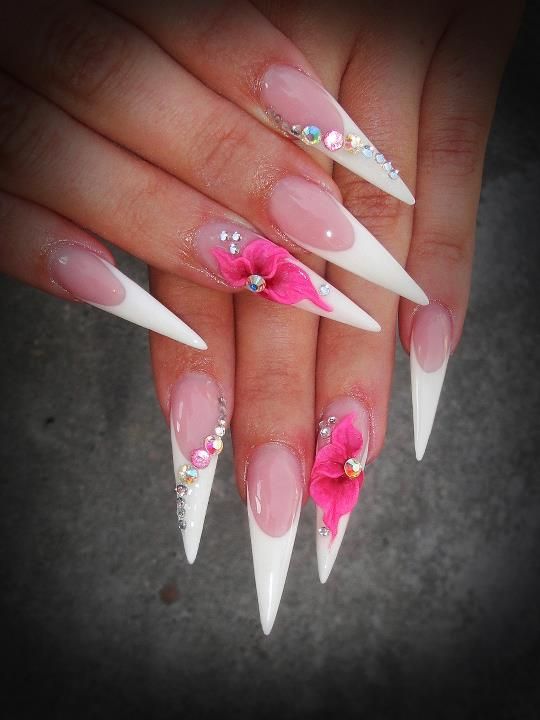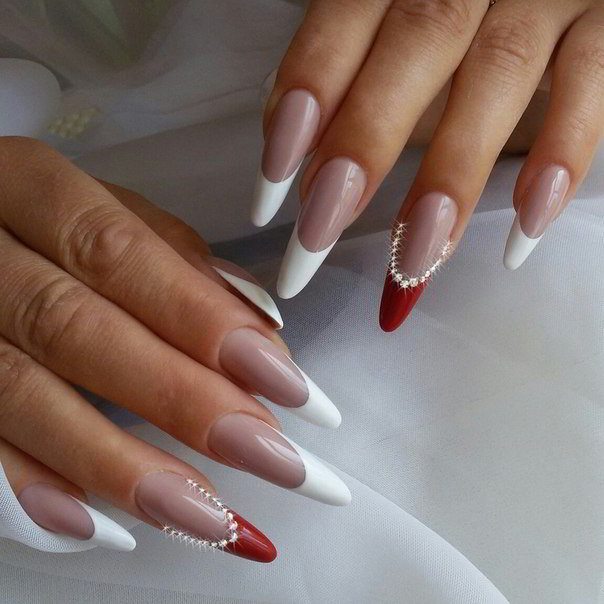 Френч на острых и очень длинных ногтях в форме стилет предназначен для особых случаев. Такой маникюр прекрасно и смело подчеркнет праздничный или вечерний лук. Острый френч стилет, декорированный блестками и стразами, выглядит своеобразно. А оригинальные рисунки на улыбке или френч ярко красного цвета, дополненный лепкой, привлекут взгляды окружающих. Замечательно и необычно выглядит френч на острых и очень длинных ногтях с рисунком на улыбке под названием «скрепка». Выполняется такой рисунок в основном в бело-черном цвете. Френч стилет выбирают смелые и уверенные в себе дамы, которые не бояться бросить вызов обществу.