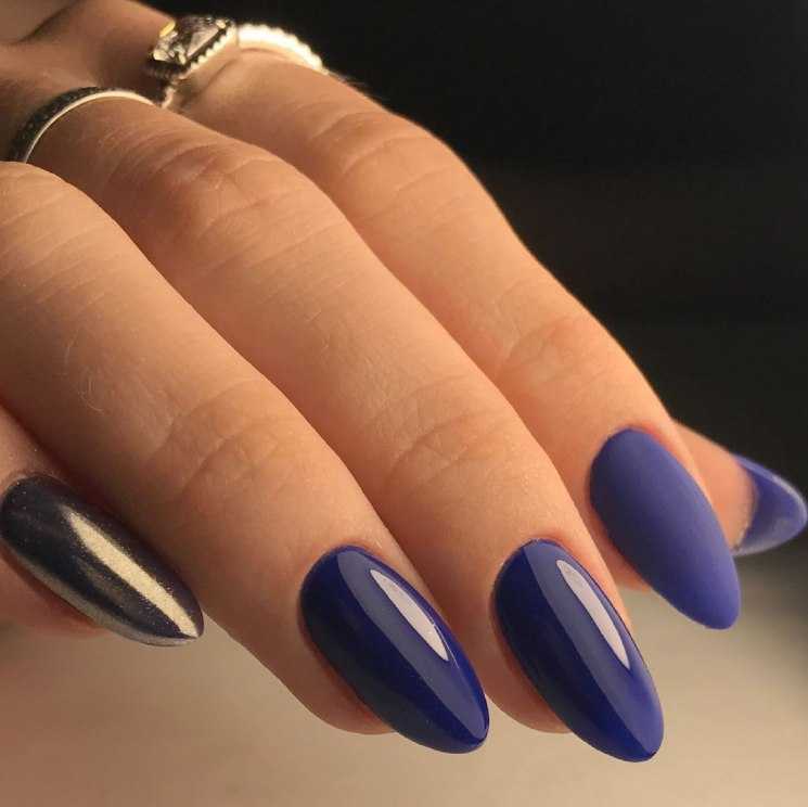 Актуально будет добавить рисунки геометрических фигур, птичек или белый горошек. Невероятно красивый дизайн можно получить, если покрыть все ногти матовым лаком, а на безымянный палец и мизинец нанести блестки. Такое оформление ноготков сегодня можно часто увидеть на фото голливудских звезд.