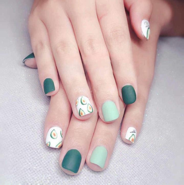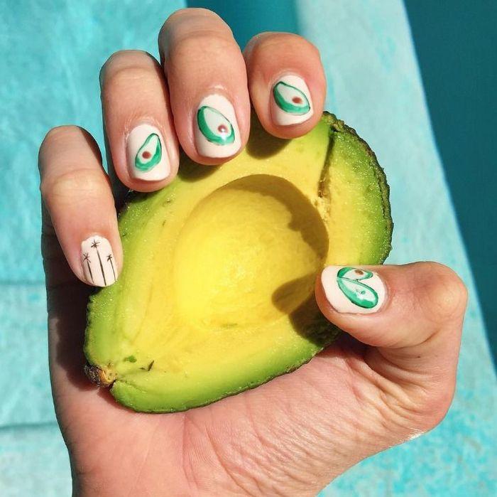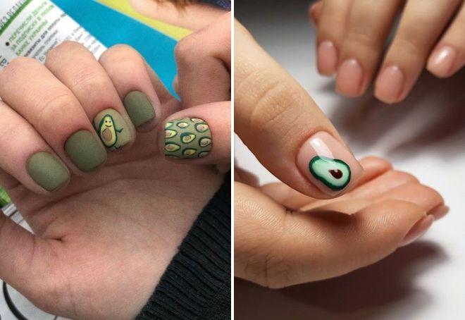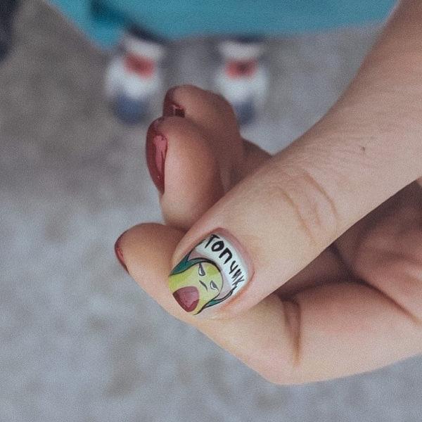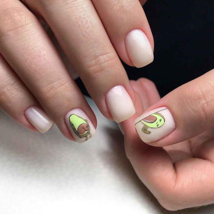 Авокадо считается одним из популярных изображений и часто причисляется к веселому маникюру. А все благодаря самому авокадо, который мастера рисуют с ручками, ртом, глазами и ножками, что позволяет оживлять вкусный фрукт на ваших ногтях. Подобный метод повлек за собой целую подборку различной тематики, где авокадо может спать, петь песни, танцевать, плакать, жаловаться на жизнь (где потребуется соответствующая подпись) и многое другое.