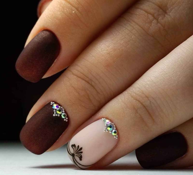 Матовый является не практичным, из-за пористой текстуры быстро грязнится, но если делать маникюр в темных тонах, то загрязнения будут почти не видны. Делая матовый маникюр на короткие ногти не стоит выбирать светлые и утонченные рисунки, лучше добавить блесток, чтобы скомпенсировать нейтральность.