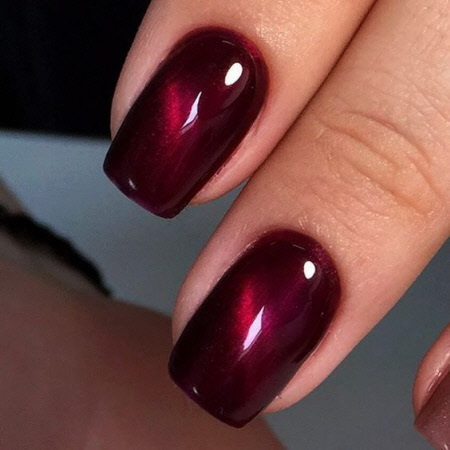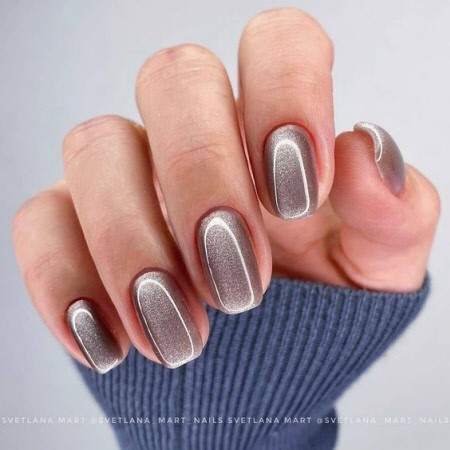 Такой маникюр отлично подойдет на короткие ногти, “кошачий глаз” – тип лакового покрытия в составе которого имеются мелкодисперсные отражающие элементы.