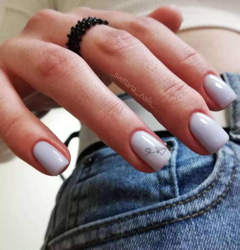Маникюр в стиле минимализм смотрится умеренно на коротких ногтях и представляет собой однотонное покрытие с наличием не больших маленьких рисунков.