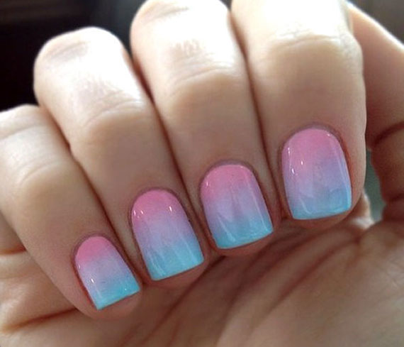 Так же можно использовать дизайн в стиле Омбре. Для его выполнения необходимо нанести основной цвет лака, просушить его. В специальной посуде смешать края лака основного цвета и контрастного.