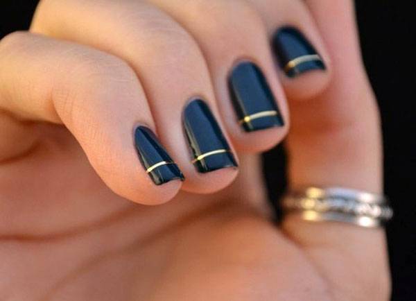 Маникюр с полосками отличается лаконичностью и простотой выполнения. Для создания линий на коротких ногтях понадобится тонкая кисть или скотч-лента.