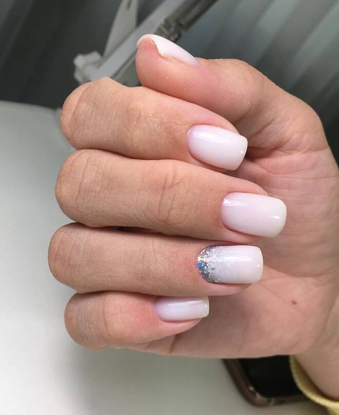 Маникюр с блестками приходится ярким акцентом в образе на коротких ногтях. Блестки, создавая интересную текстуру, не могут остаться незамеченными.