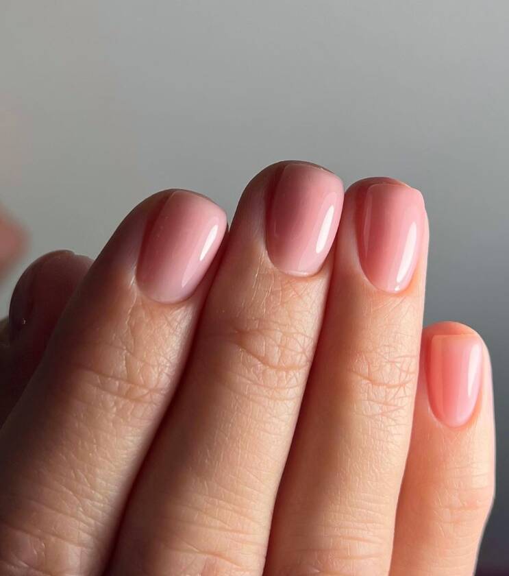 Нежный маникюр в нейтральных оттенках – подходящий вариант для коротких ногтей. Однотонное нюдовое покрытие выглядит просто, но в то же время благородно. При этом светлые лаки спокойных оттенков визуально удлиняют пальцы рук, поэтому возьмите эту хитрость на заметку.