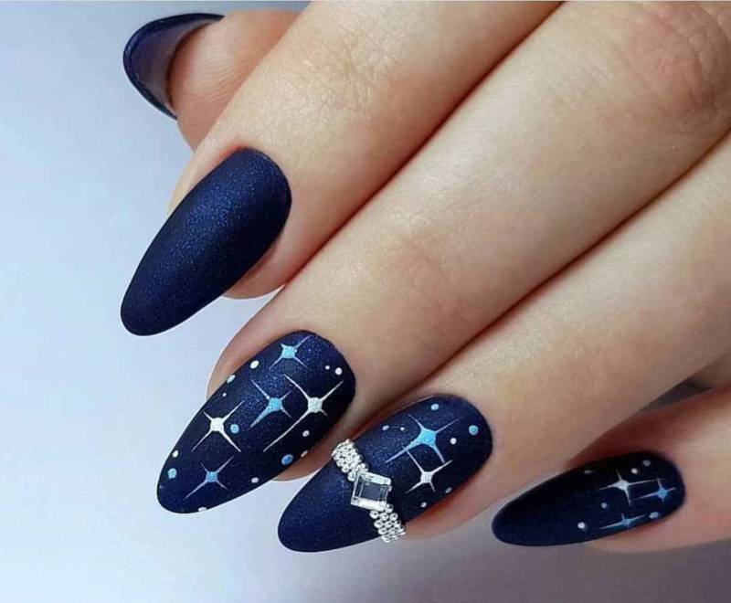 Этот дизайн подойдет для тех, кто любит нежные и элегантные образы. Используйте мелкие стразы в форме звездочек, чтобы добавить немного блеска на овальные ногти.