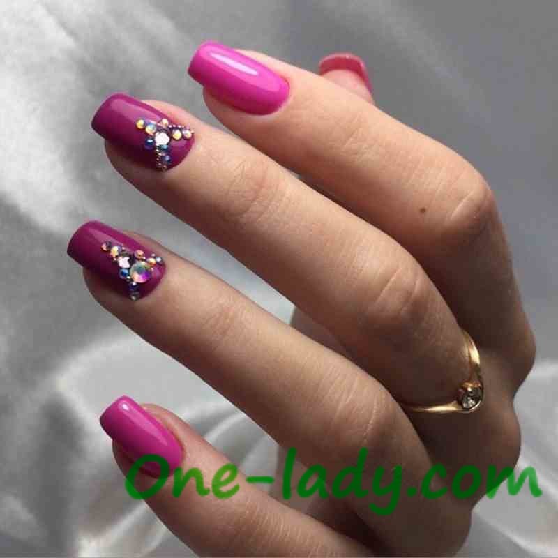 Стразы в основном используются на ногтях, покрытых гель-лаком в один тон. Такие украшения выглядят обзорно, гармонично и элегантно одновременно. Камни могут совпадать по цвету с лаком для ногтей или иметь ярко выраженный противоположный тон.