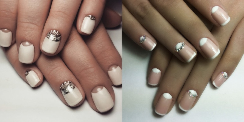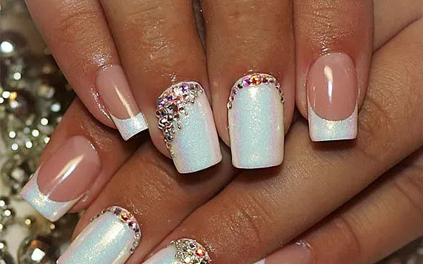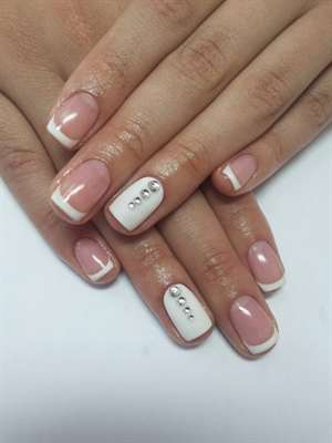 Фаворитом среди девушек являются французские ногти, украшенные стразами. Стразы придают особый эффект классическому французскому маникюру белого цвета.