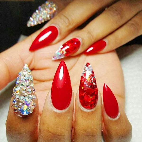 Вариант ниже не совсем подходит для массивной, тяжёлой инкрустации, но также часто применяется для крепления маленьких стразинок с плоским дном. Сегодня на пике популярности яркие цвета лака, такие как красный и розовый. Они отлично сочетаются с любой одеждой и подчеркивают женственность