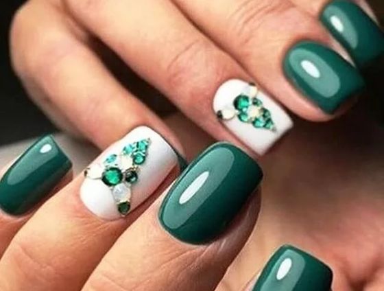 Среди актуальных предложений можно выделить однотонное глянцевое либо матовое покрытие с аккуратными узорами из мелких кристаллов, комбинированный дизайн со стразами и «икрой» в тон основному покрытию на безымянном пальчике, а также сочетание однотонного маникюра с френчем, нейл-дизайн с втиркой и «пенный» маникюр, в которых украшения только подчеркнуть изысканность выбранной техники.