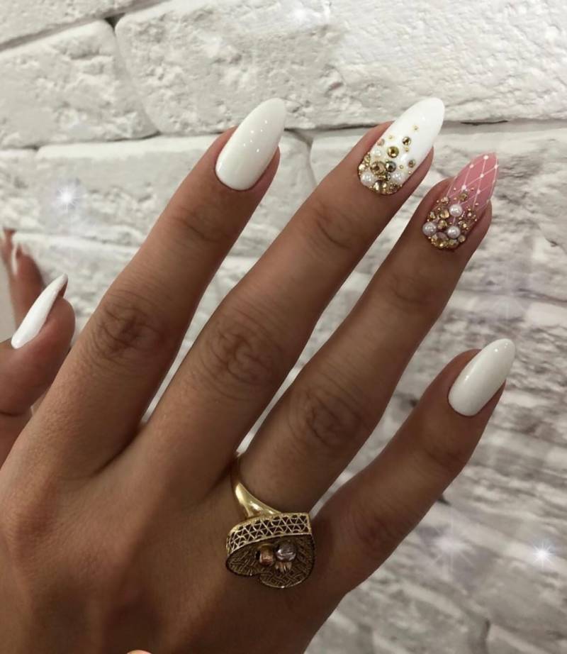 Белый маникюр со стразами 2023