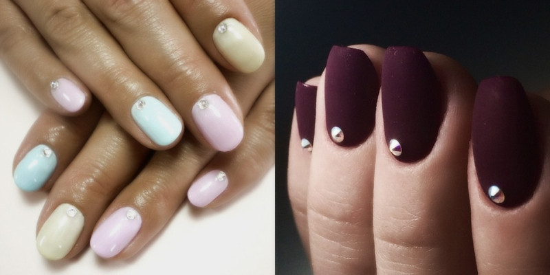 Противоположные цвета: камни одинаково красиво смотрятся в темных, светлых и пастельных тонах. Нежные, пудровые оттенки лака можно сочетать с прозрачными или одноцветными камнями.