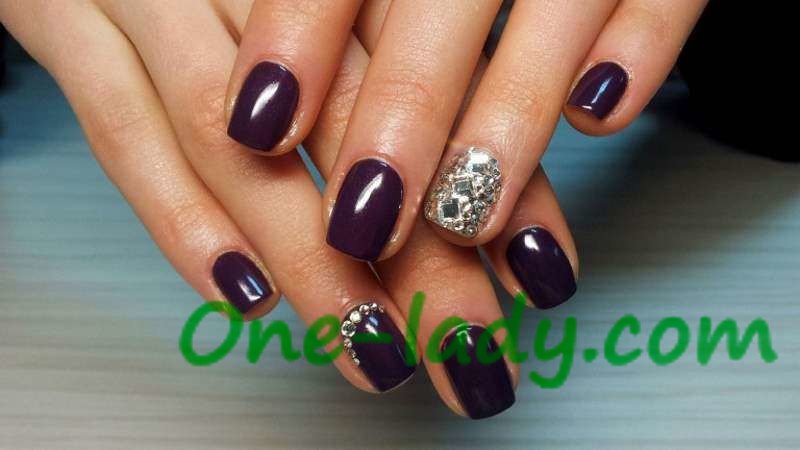 На коротких ногтях прекрасно будет смотреться монохромное покрытие темных тонов, а если на каждом ноготке в уголочке положить по одиночному стразику, то маникюр приобретет нотку роскоши и подчеркнет отличный вкус своей обладательницы.